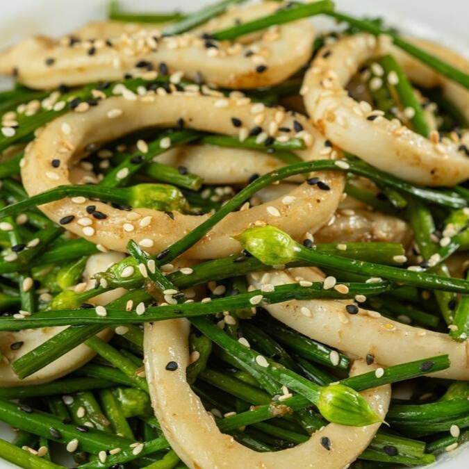 Lulas macias salteadas com nirá, resultando em um prato aromático, de sabor intenso e equilibrado. Uma combinação tradicional da culinária oriental que destaca frescor e textura em cada mordida.