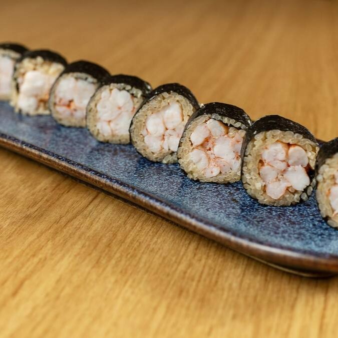Camarão pré cozido com arroz, cream cheese e cebolinha enrolado na folha de alga marinha desidratada.