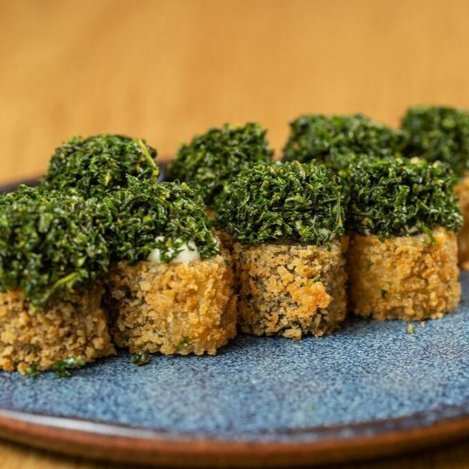 Hossomaki frito de salmão com cream cheese, coberto com couve frita levemente adocicada e molho teriaky.