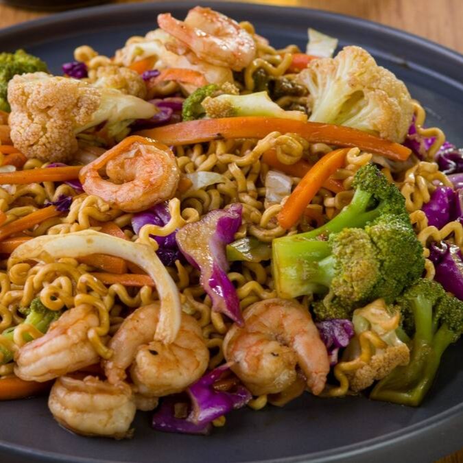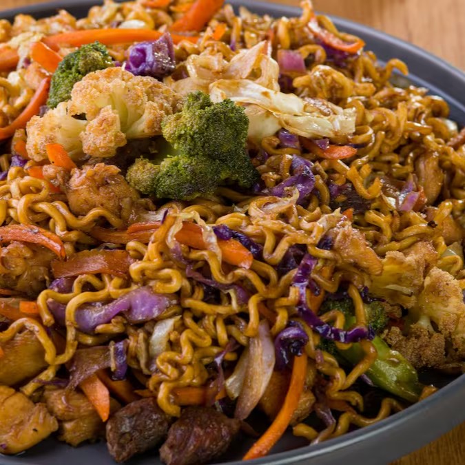 Macarrão japonês, peito de frango e filé mignon com vegetais ao molho tradicional feito com shoyu e óleo de gergelim.