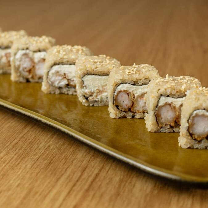 Enrolado de arroz japonês por fora da alga nori, coberto com mix de gergelim, recheado com camarão empanado na farinha de panko e frito.