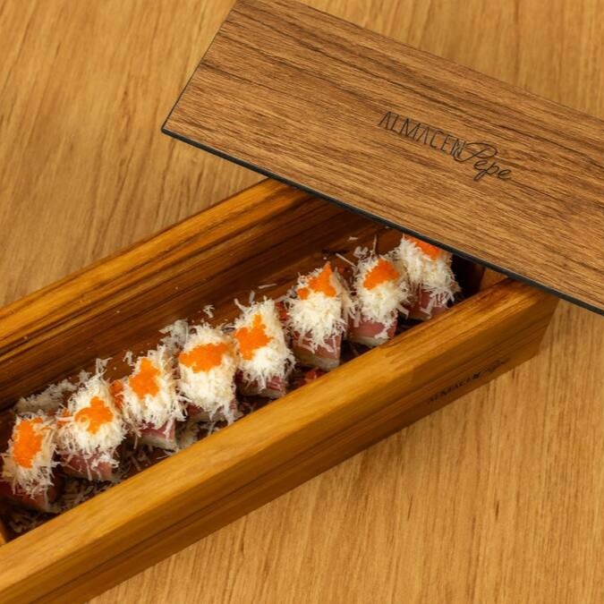 Enrrolado de arroz japones por fora da alga nori, Arroz, Salmão, Atum, finalizado com Grana Padano e Ovas massago