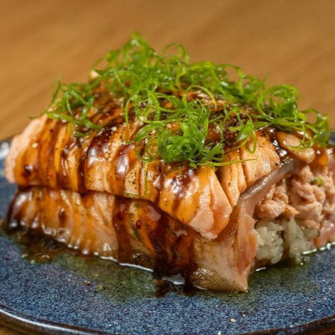 Lâmina de salmão envolvendo o arroz japonês, coberto patê de salmão e cebolinha.