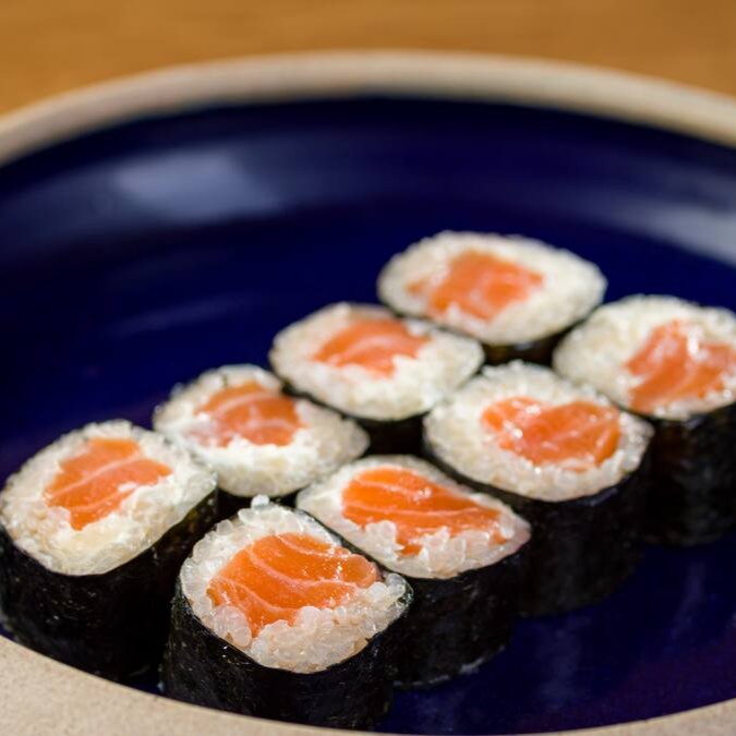 Cubos de salmão fresco, arroz, cream cheese e cebolinha enrolado na folha de alga marinha desidratada.