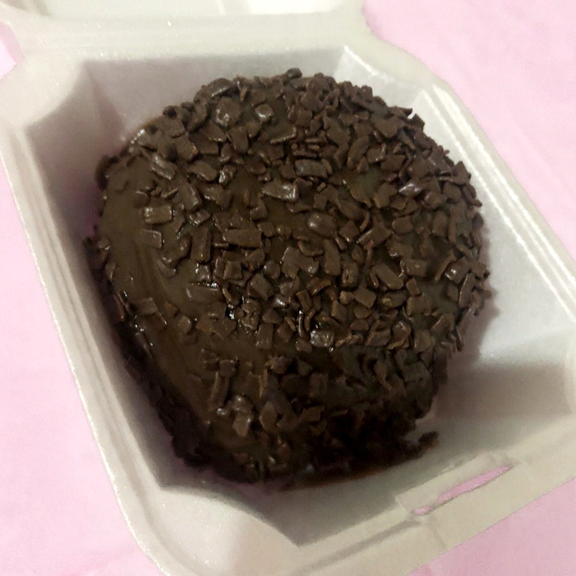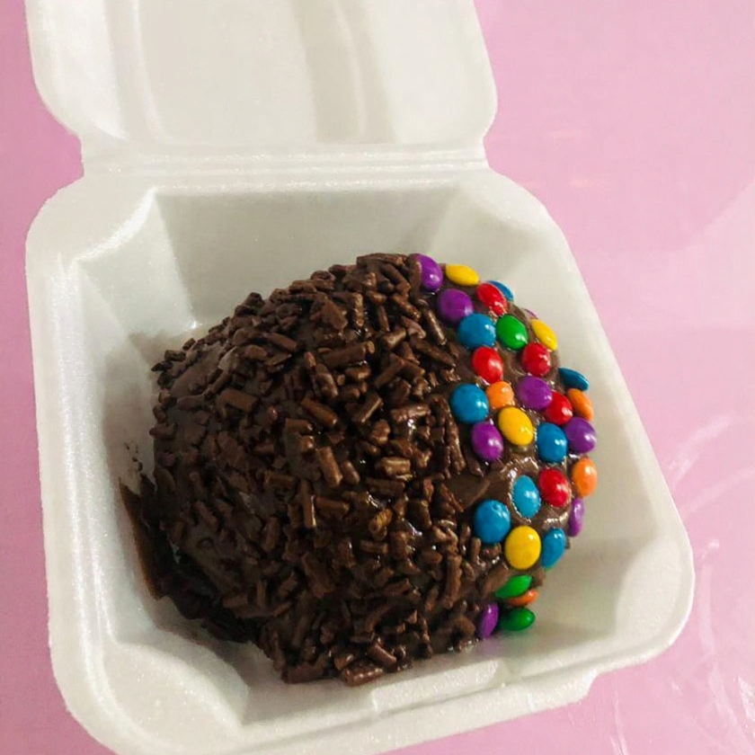 Delicioso bolo de chocolate com granulado e outro lado de bolinha de chocolate