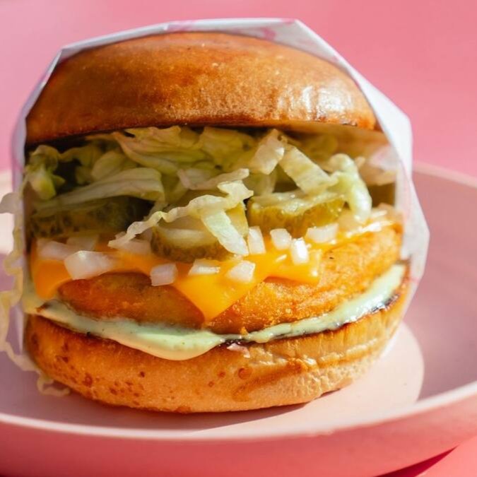 Pão brioche, chicken supreme Burger, queijo cheddar, alface americano, cebola, picles e maionese da casa