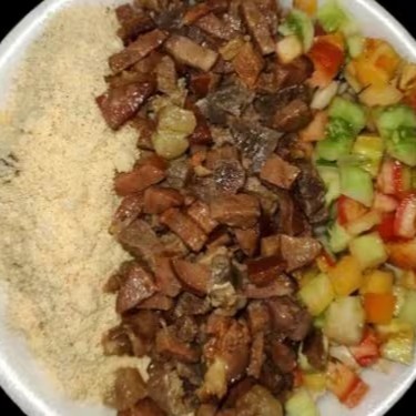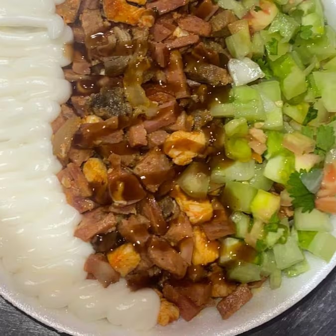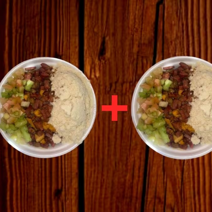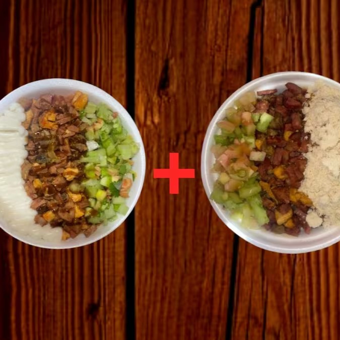 Composto por nutritivos grãos de feijão fradinho, se une a uma salada vinagrete refrescante, que traz acidez e frescor ao prato. A farofa, crocante e saborosa, adiciona uma textura especial à combinação. O coração do prato é a carne mista, com pedaços suculentos de carne bovina, frango tenro e calabresa defumada. Juntos, criam um prato cheio de sabor e texturas que satisfaz e surpreende. Uma verdadeira experiência gastronômica!
