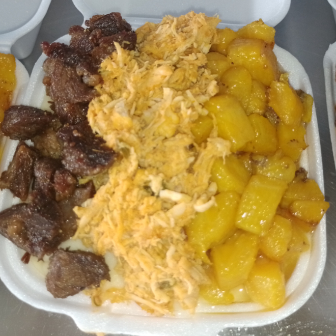 PIRÃO DE AIPIM, CARNE DO SOL, BANANA E FRANGO.