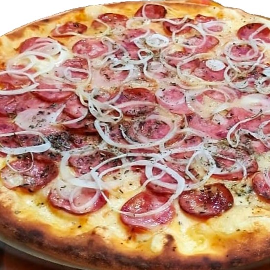 Massa tradicional, molho artesanal de tomate, mussarela, calabresa, cebola, azeitona e orégano