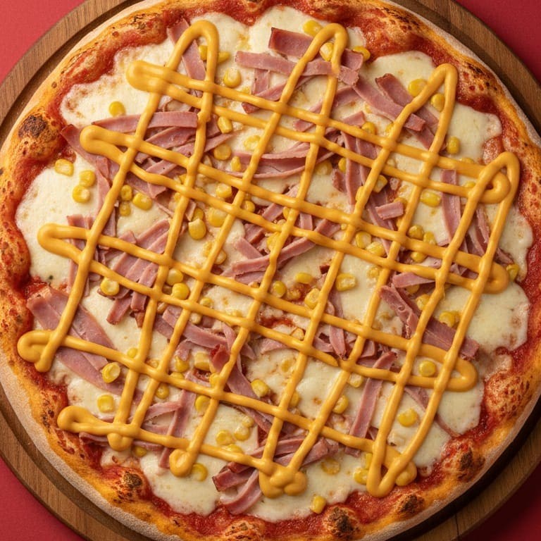 Molho, Mussarela, Presunto, Milho, Cheddar e Catupiry.