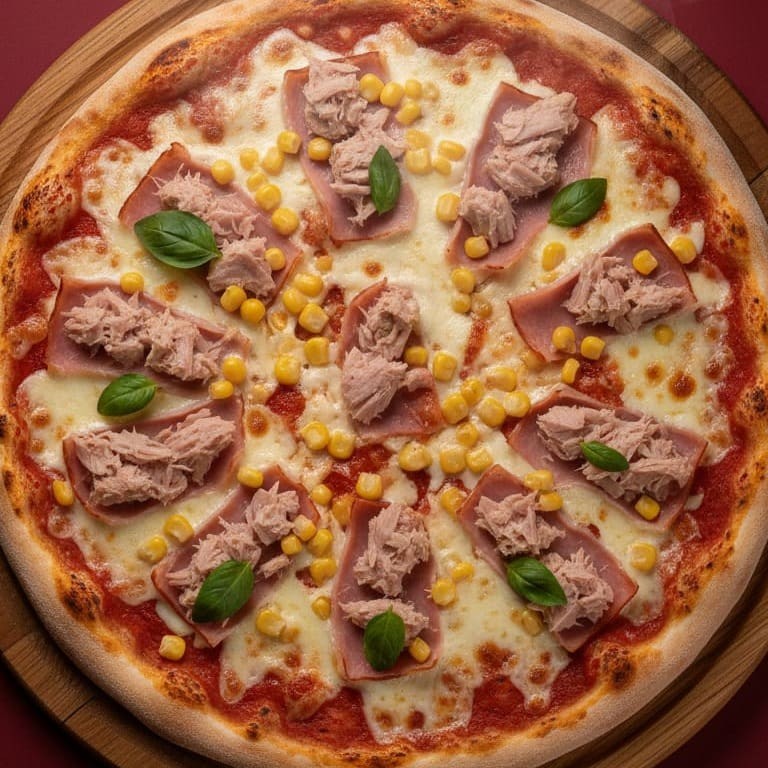 Molho, Mussarela, Presunto, Presunto, Atum, Milho e Manjericão.