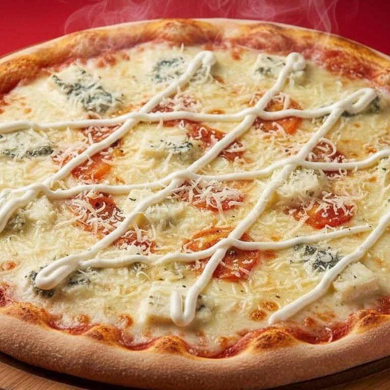 Molho, Mussarela, Gorgonzola, Parmesão e Catupiry.