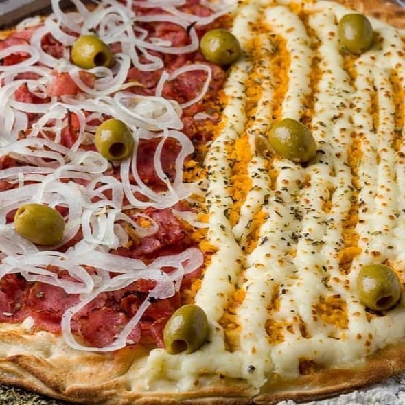 Pizza tamanho família (12 fatias) metade calabresa, mussarela e cebola + metade frango, mussarela e Catupiry