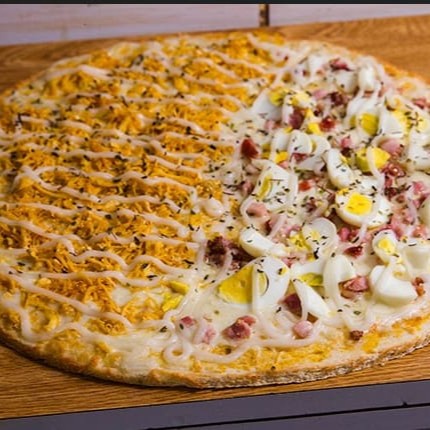 Pizza tamanho familia 12 pedaços. Meia portuguesa (mussarela, presunto, cebola e ovos) Meia frango com Catupiry (Mussarela, frango e Catupiry)