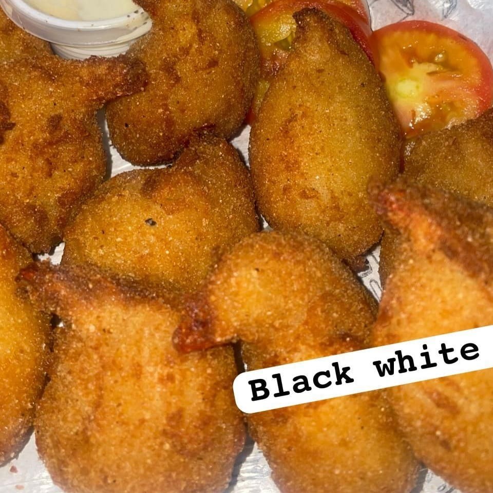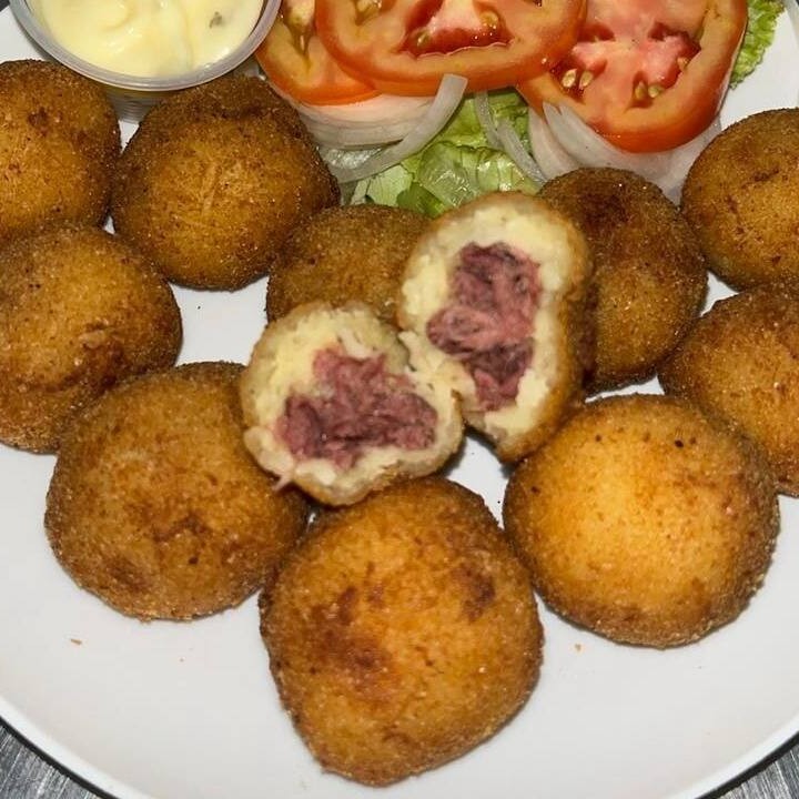 Deliciosa porção de bolinhos de frango acompanhado de uma porção de molho de alho. (12 unidades)