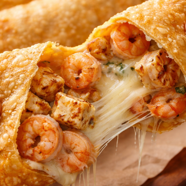 Camarão, cream cheese e queijo mussarela.