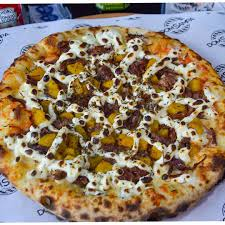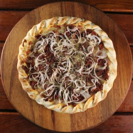 Calabresa, mussarela, presunto, pimenta calabresa e cebola.