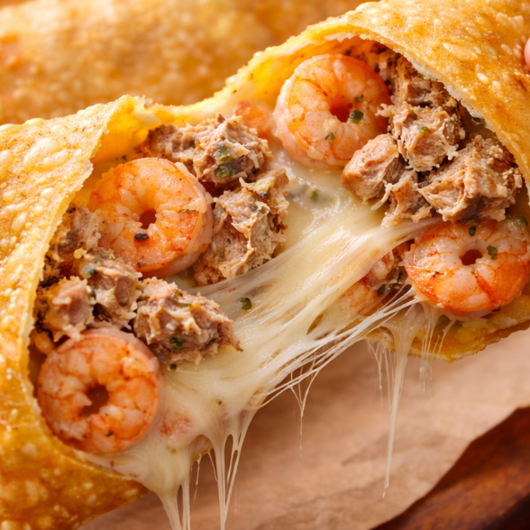 Camarão, atum e queijo mussarela.