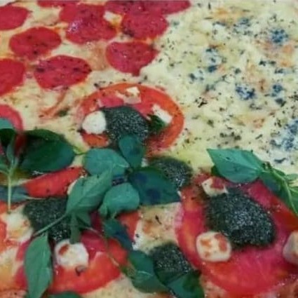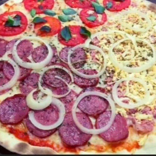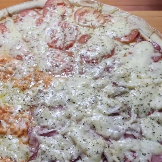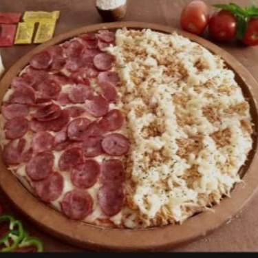Pizza Grande,8 Fatias.Metade com a tradicional calabresa com cebola bem temperada e metade com a irresistível 4 queijos: Catupiry Original, gorgonzola, mussarela e cheddar. Uma combinação cremosa e cheia de sabor que conquista qualquer paladar!