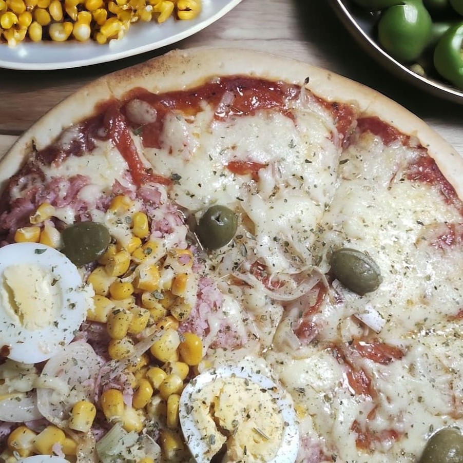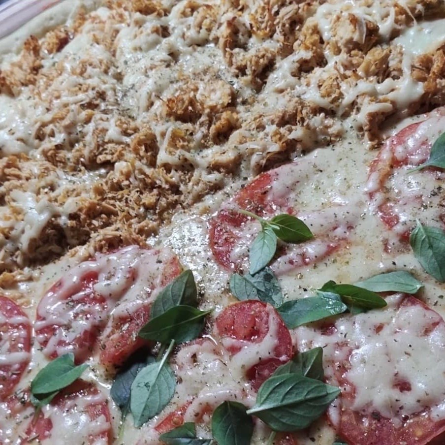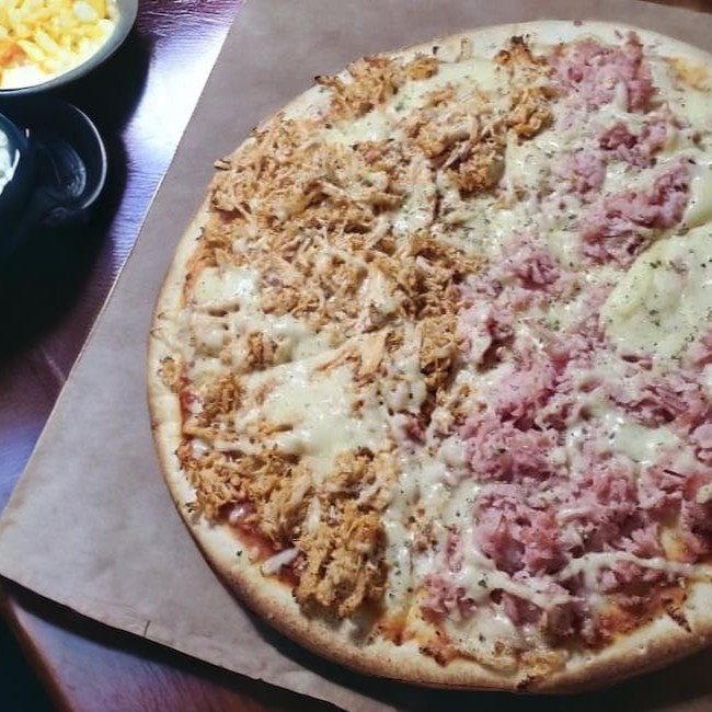 Uma pizza grande, 8 fatias, deliciosa e bem recheada, metade com o sabor clássico do presunto e metade com frango desfiado suculento. Perfeita para quem gosta de variedade e quer agradar todos na mesa!