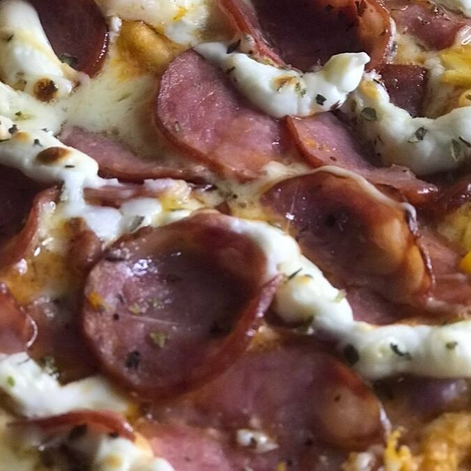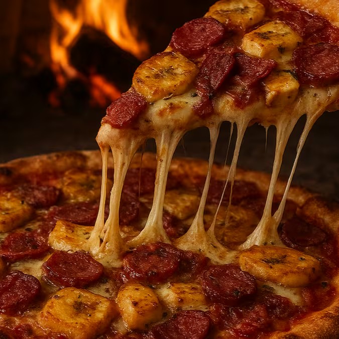 Deliciosa Pizza Feita com Molho de Tomate Artesanal, Queijo Mussarela Derretido, Carne de Fumeiro, Queijo Coalho, Banana da Terra Frita e Orégano.