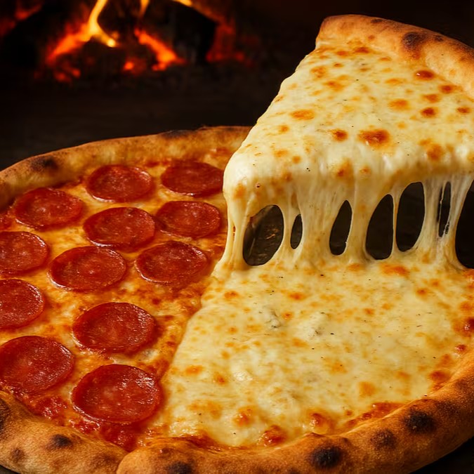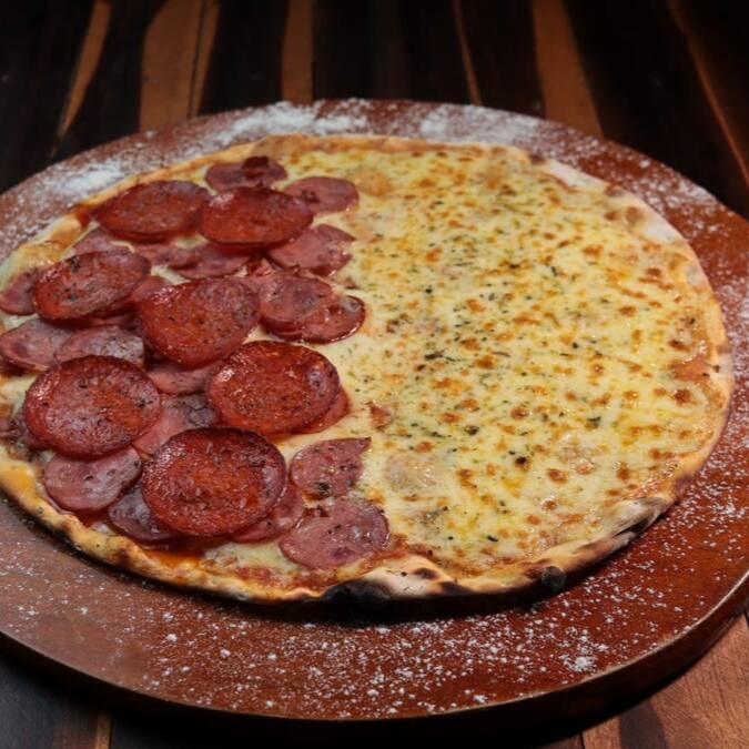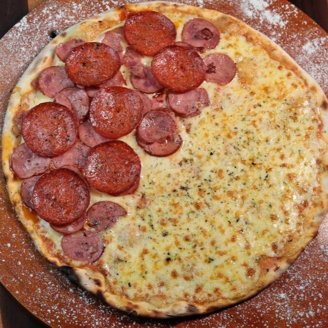 Deliciosa Pizza Feita com Massa Saborosa Feita no Forno a Lenha, Metade Calabresa Premium em Rodelas e Metade Quatro Queijos.