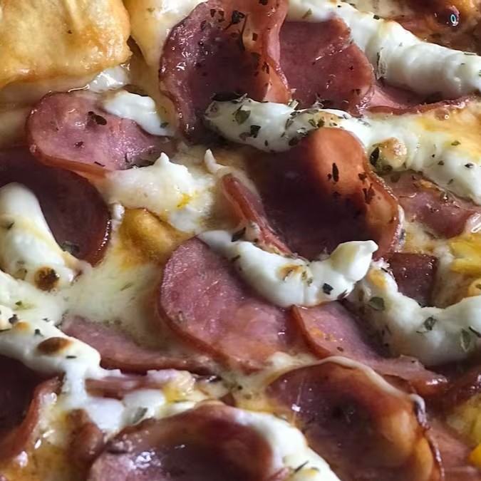 Molho de tomate artesanal, mozarela, rodelas finas de calabresa, e cebola fatiada, com o delicioso aroma do orégano.
