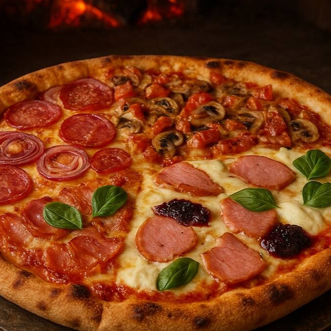 Deliciosa Pizza Familia Feita no Forno a Lenha, Calabresa Acebolada, Metade Siciliana, que Leva Bacon, Tomate e Champignon, e Nossa Imperialle, Feita com Lombinho Canadense, Geléia de Amora, Catupiry Original Cremoso e Manjericão.