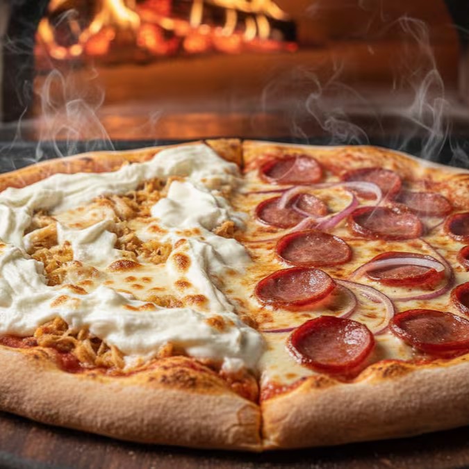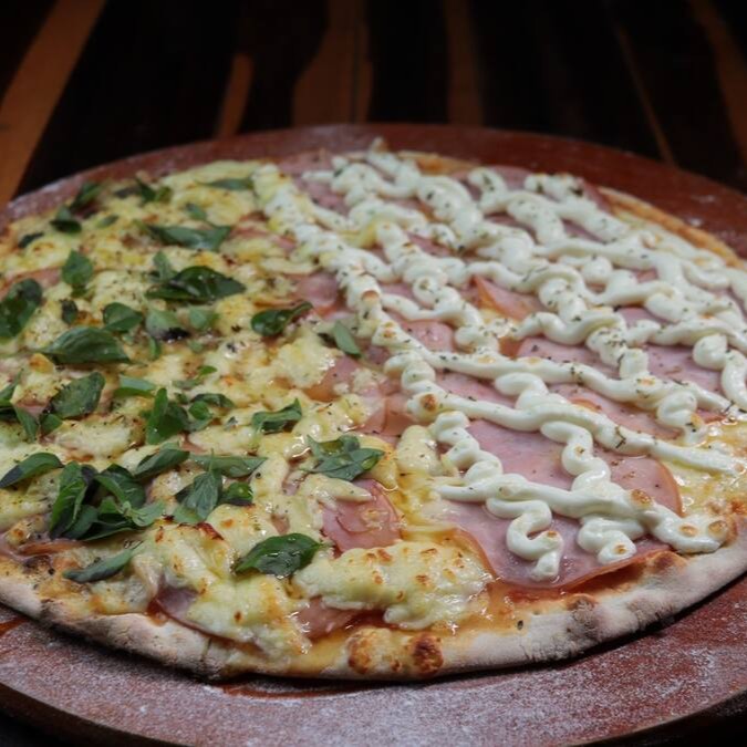 Deliciosa Pizza Feita no Forno a Lenha, Recheada de Frango Bem Temperado Desfiado com Catupiry Original, Metade Portuguesa Presunto, Ovos e Cebola, Metade Quatro Queijos, Mussarela, Catupiry Original, Provolone e Gorgonzola.