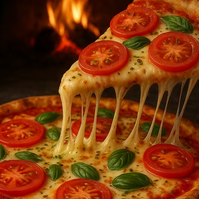 Deliciosa Pizza Feita no Forno a Lenha , Molho de Tomate Artesanal, Queijo Mussarela Derretido, Tomate em Rodelas, Finalizado com Manjericão e Orégano.
