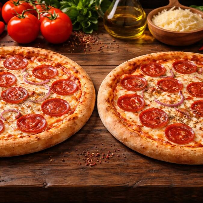 Escolha os sabores de 2 Pizzas Família e acompanhe com 2 Coca-Colas de 1 litro para garantir a refrescância. Serve até 8 pessoas, perfeito para reunir a galera e aproveitar cada fatia!