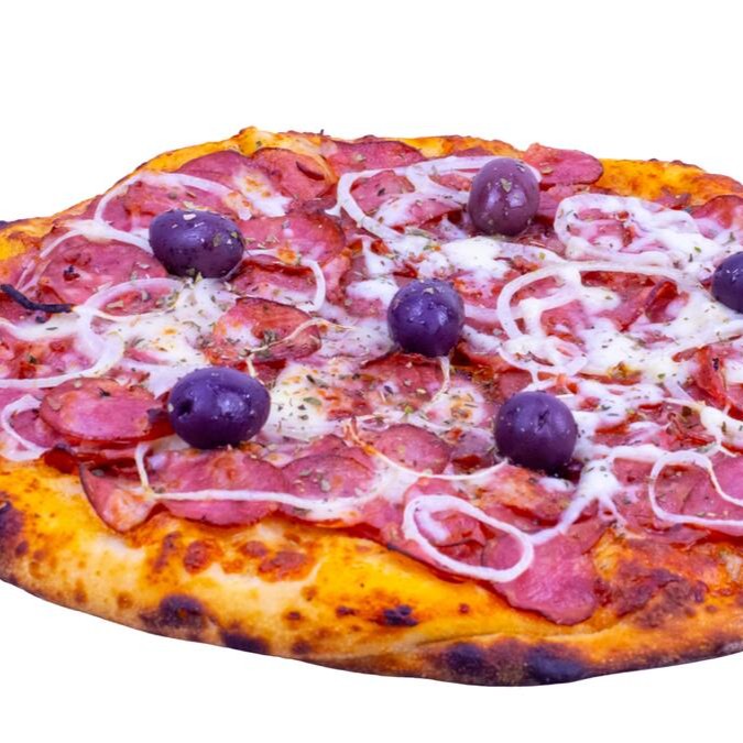 1/2 Calabresa: Calabresa defumada de alta qualidade, coberta com queijo derretido e um toque de cebola, garantindo um sabor intenso e delicioso.