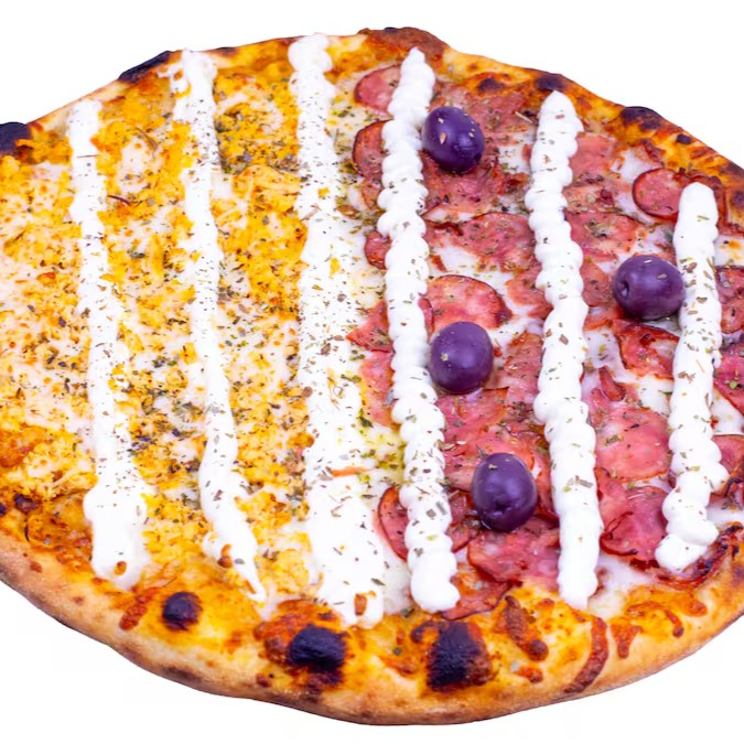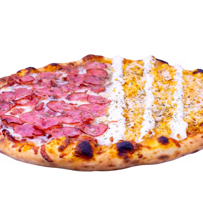 Desfrute da nossa deliciosa Pizza Meio Frango com Catupiry e Meio Calabresa Especial!