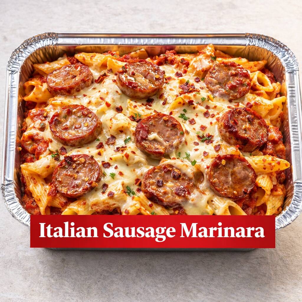 Penne ao molho de tomate temperado com ervas, coberto com linguiça toscana em rodelas e queijo gratinado.
