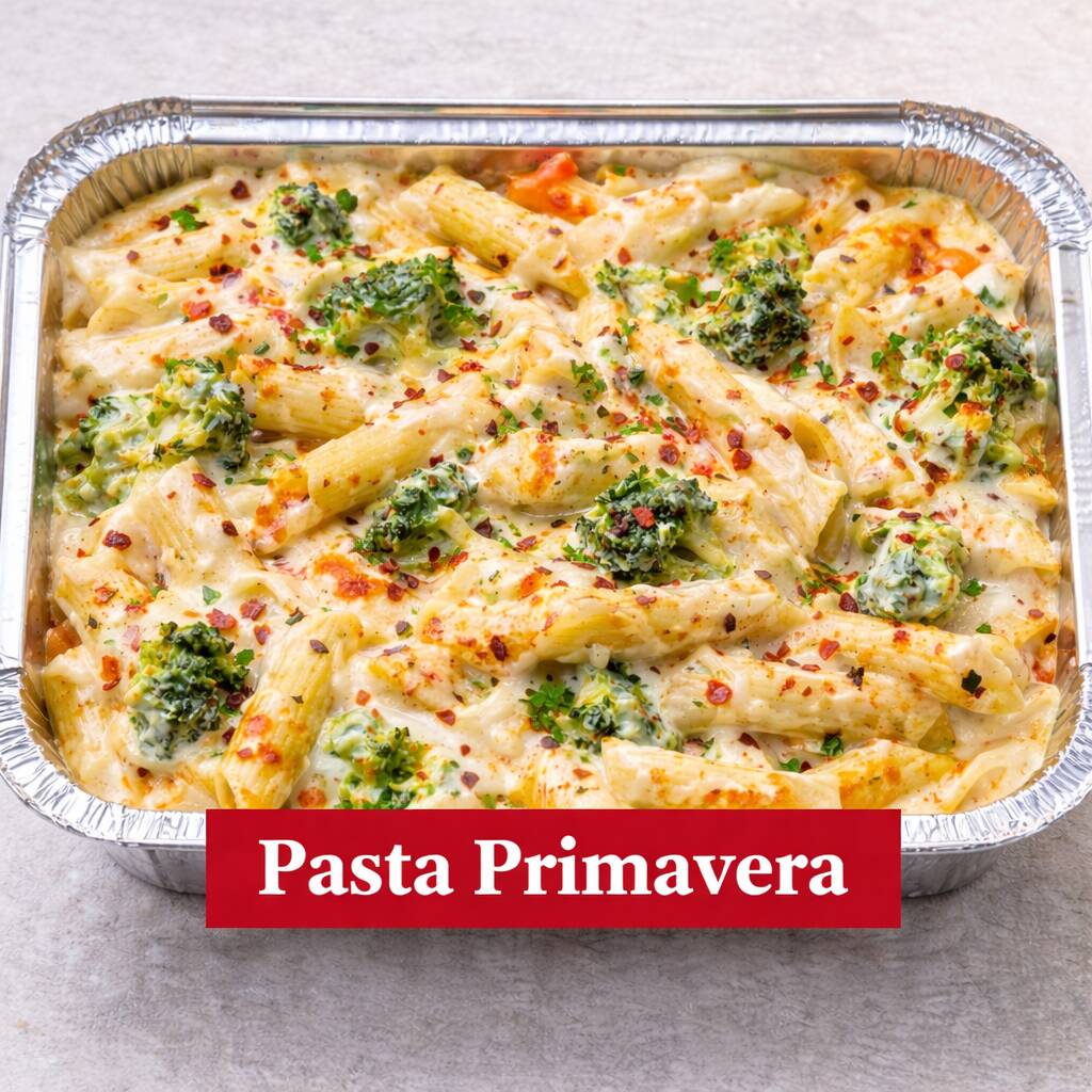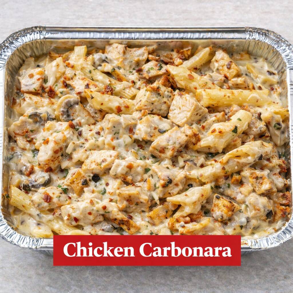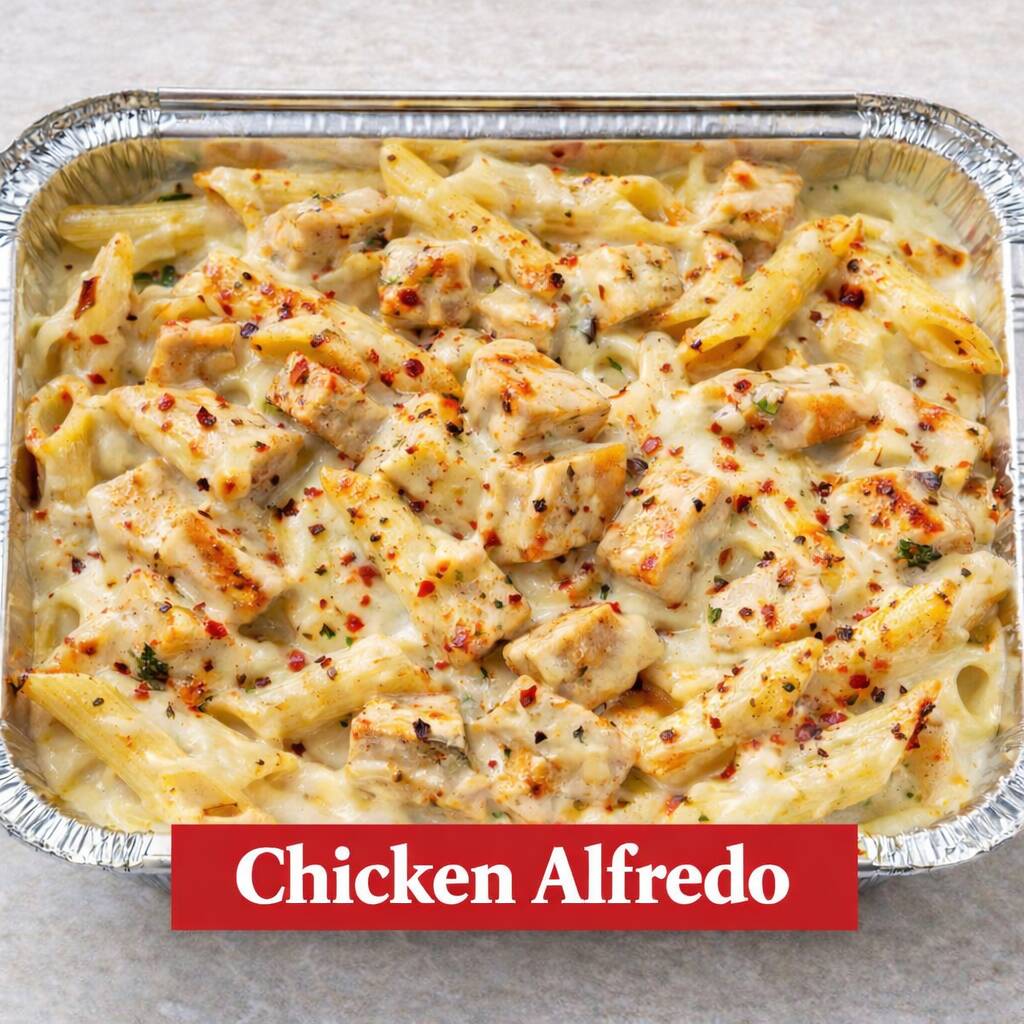 Penne ao molho Alfredo cremoso com cubos de frango, coberto com muçarela e gratinado no forno até dourar. Servido quente na marmita individual.