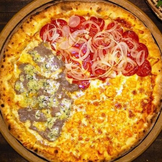 Molho de tomate, mussarela, calabresa pré assada, cebola e orégano
