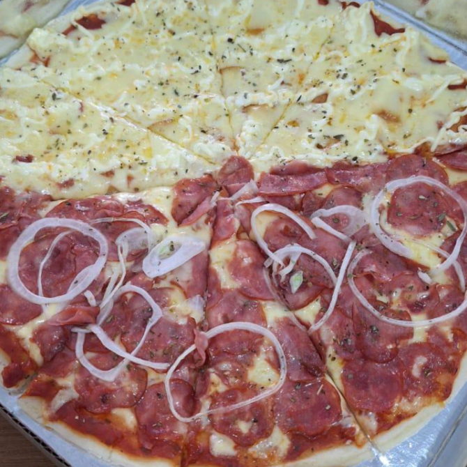 Pizza Grande 8 fatias: Calabresa acebolada e Mista: Mussarela e Presunto.