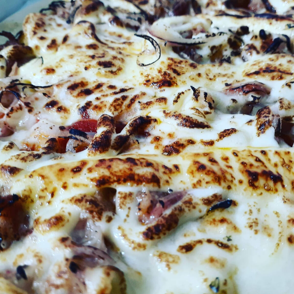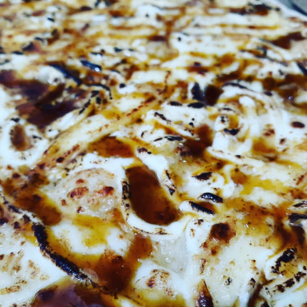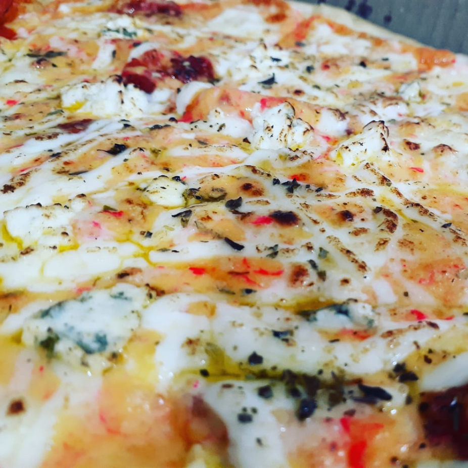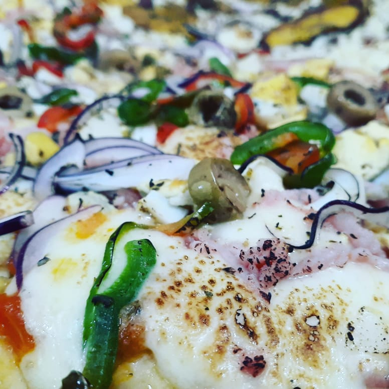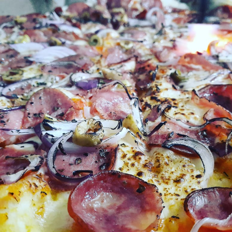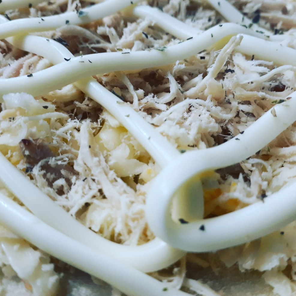 Massa artesanal, molho artesanal, mussarela, frango, marinado em ervas finas, Catupiry e orégano.