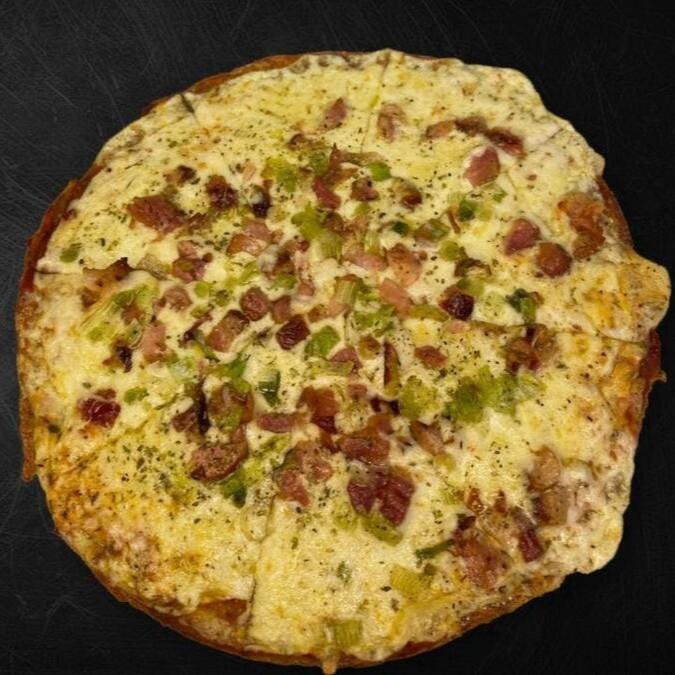 Massa Low Carb super crocante (Farinha de castanha, farinha de linhaça, psyllium, fermento biológicoe ovo) coberta com Molho de tomate da casa e caprichosamente recheada com muçarela, bacon e alho poró.