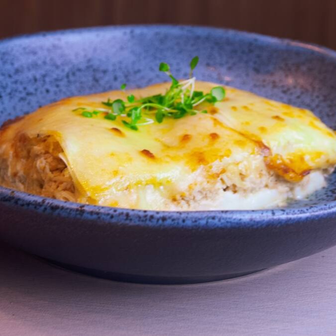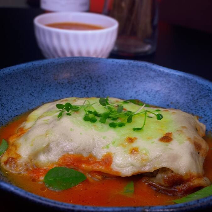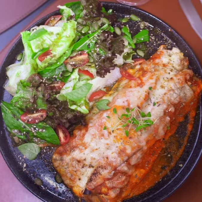Panqueca de Patinho moído, molho de tomate artesanal e mussarela. Acompanha mix de folhas, tomates cereja e molho pesto da casa.