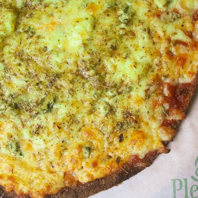 Massa Low Carb super crocante (Farinha de castanha, farinha de linhaça, psyllium, fermento biológico e ovo) coberta com Molho de tomate da casa, bem recheada com mussarela, gorgonzola, cream cheese e provolone.