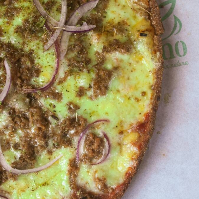 Massa Low Carb super crocante (Farinha de castanha, farinha de linhaça, psyllium, fermento biológico e ovo) coberta com Molho de tomate da casa e caprichosamente recheada com mussarela, atum e cebola roxa.