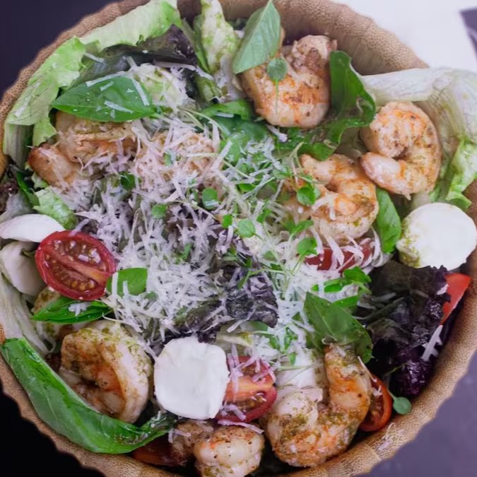 Camarões grelhados, mix de folhas(Alface roxo, alface americano e rúcula), mussarela de búfala, molho pesto, tomate cereja, nuvem de parmesão.