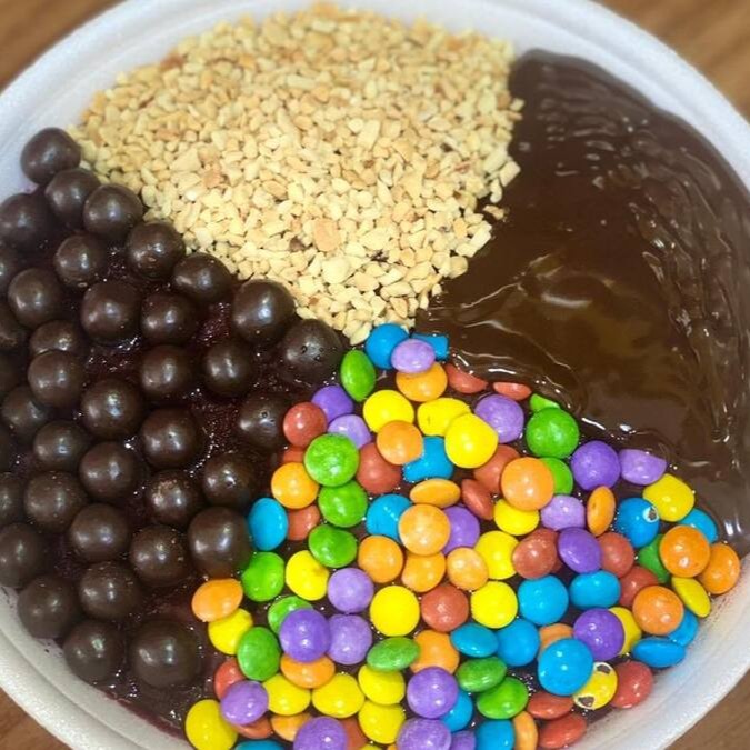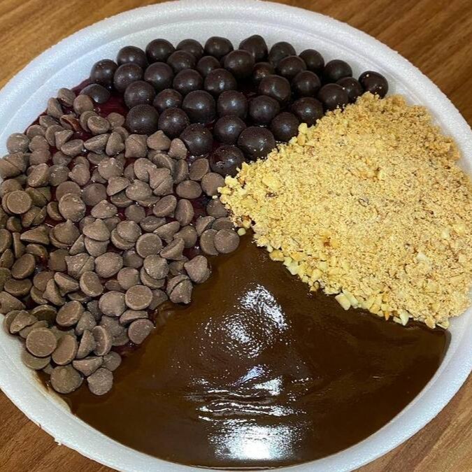 400ml de Açaí + 100ml de acompanhamentos ( Creme de avelã + Disquete + Chocoball + Amendoim ) taxa Grátis + entrega Rápida