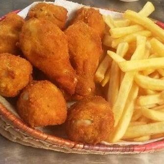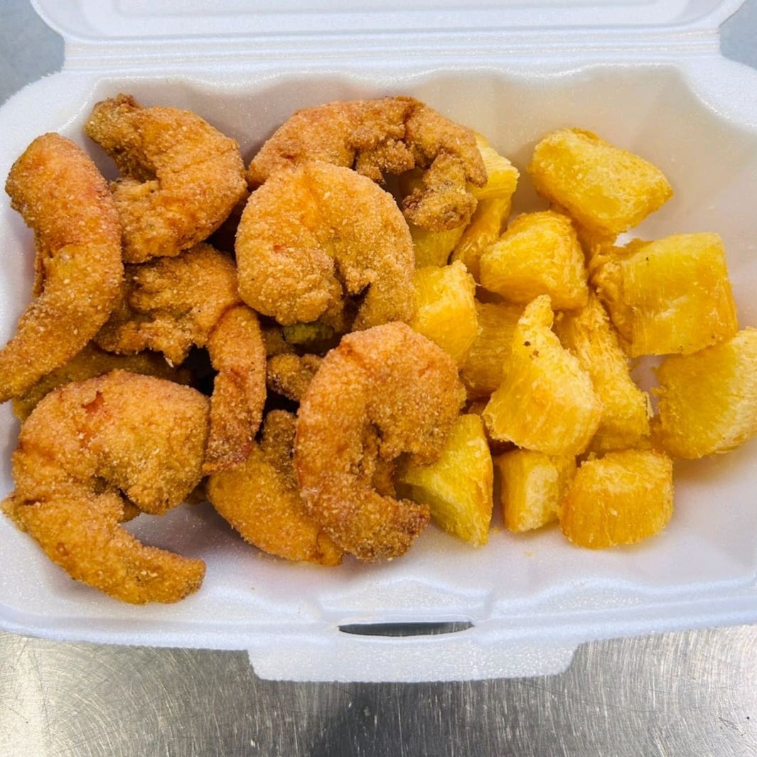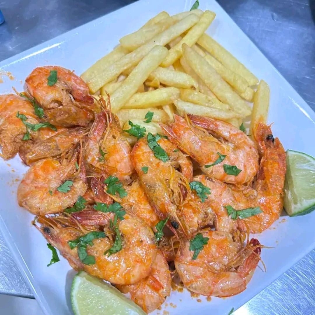 Camarão sem cabeça bem temperadinho empanado e fritos na hora+ fritas de sua preferência Trata-se de um petisco que serve 2 a 3 pessoas, ( Obs : Não é o filé )