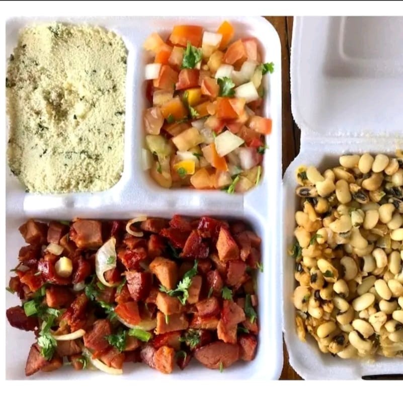 Um clássico de boteco! Bem arrumadinho pra ninguém botar defeito. ( Feijão fradinho temperado, farofa gourmet, vinagre e a proteína de sua preferência.
