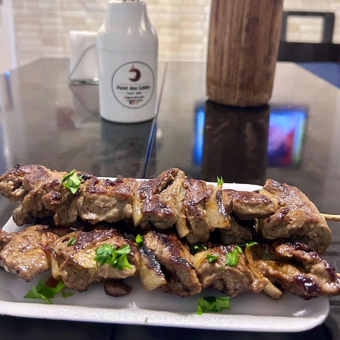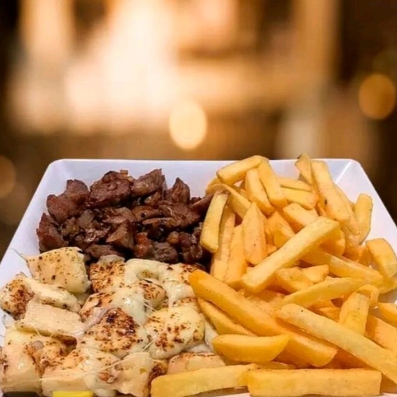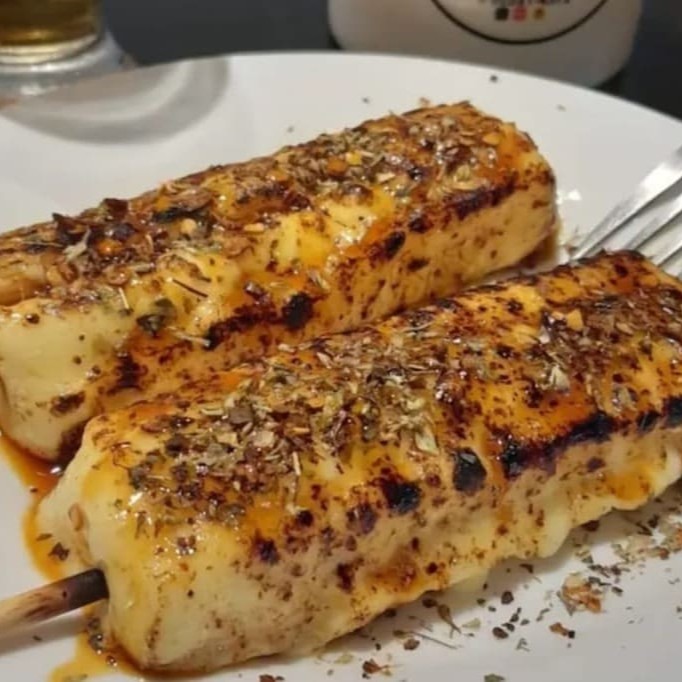 Espetinho de, Feito na chapa ao alho, molho especial da casa e azeite de oliva. Farofa e vinagrete opcional