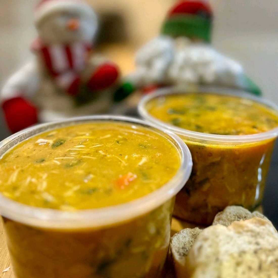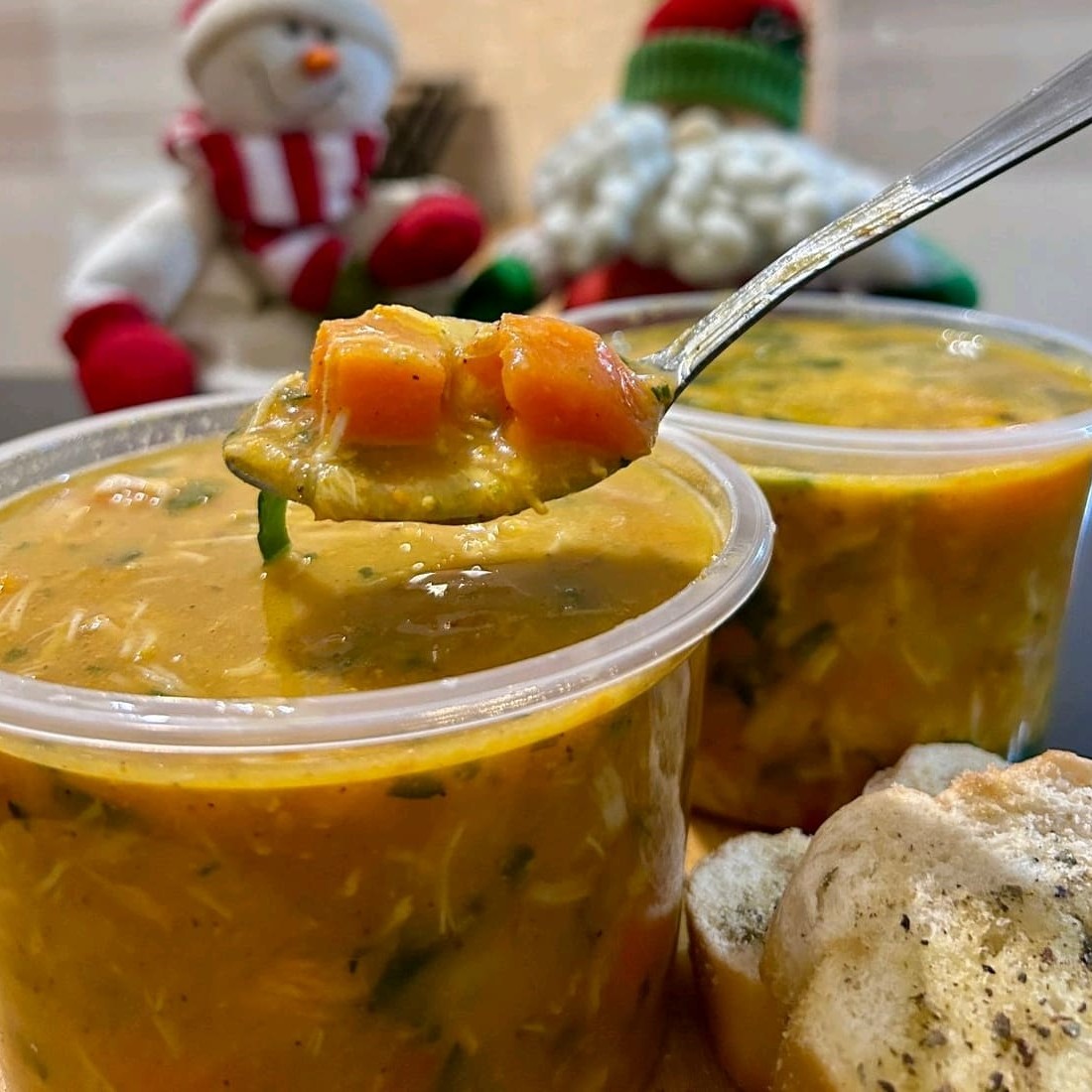 Recheio de filé de frango desfiado e bem temperadinho, legumes selecionados ( batatinha, abóbora,cenoura e couve ) sopinha super leve, feita com produtos naturais sem adicionais de itens gordurosos. Acompanha torradinhas quentinhas e crocantes grátis! Atenção!!!!!! ( Clientes com hipertensão, por favor informar na Obs do pedido )