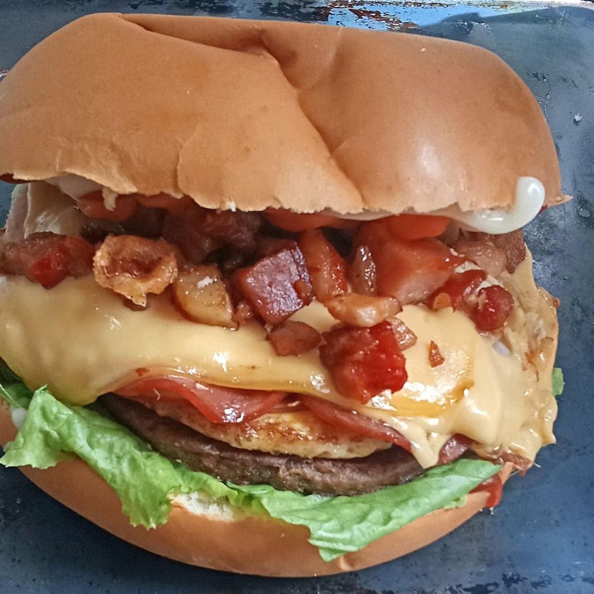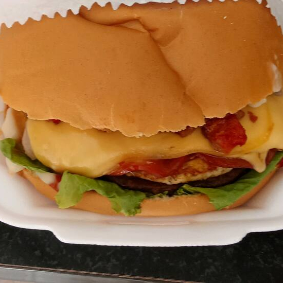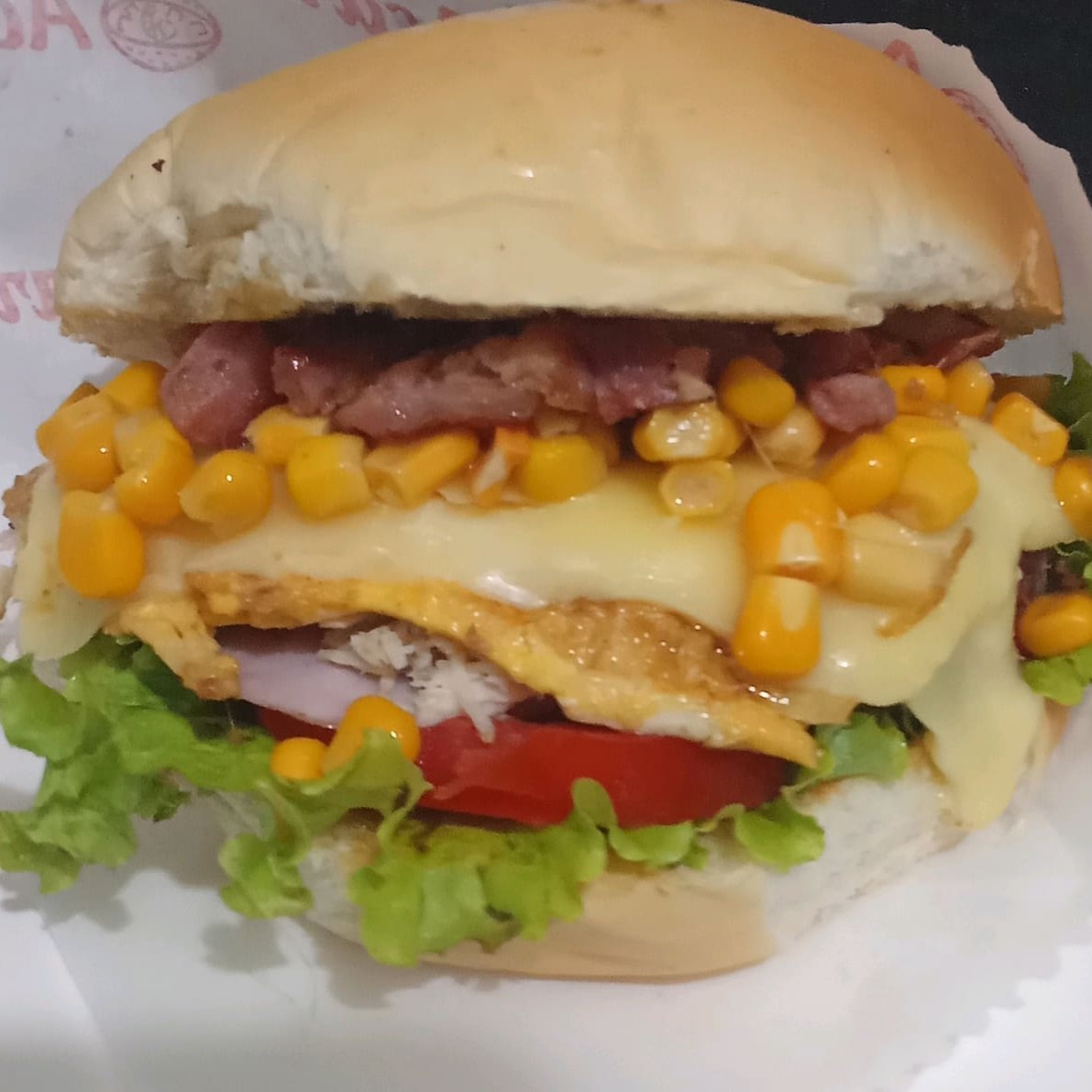 Um lanche completo e poderoso pra matar a larica de verdade! Pão com duas carnes de hambúrguer, ovo, presunto, muçarela, milho, bacon, tomate, alface e um toque cremoso de cheddar. É sabor em cada mordida
