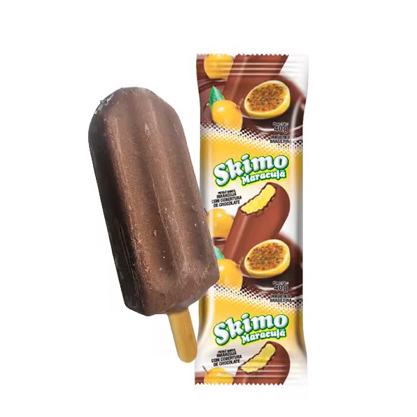 Picolé de maracujá com cobertura de chocolate meio amargo.